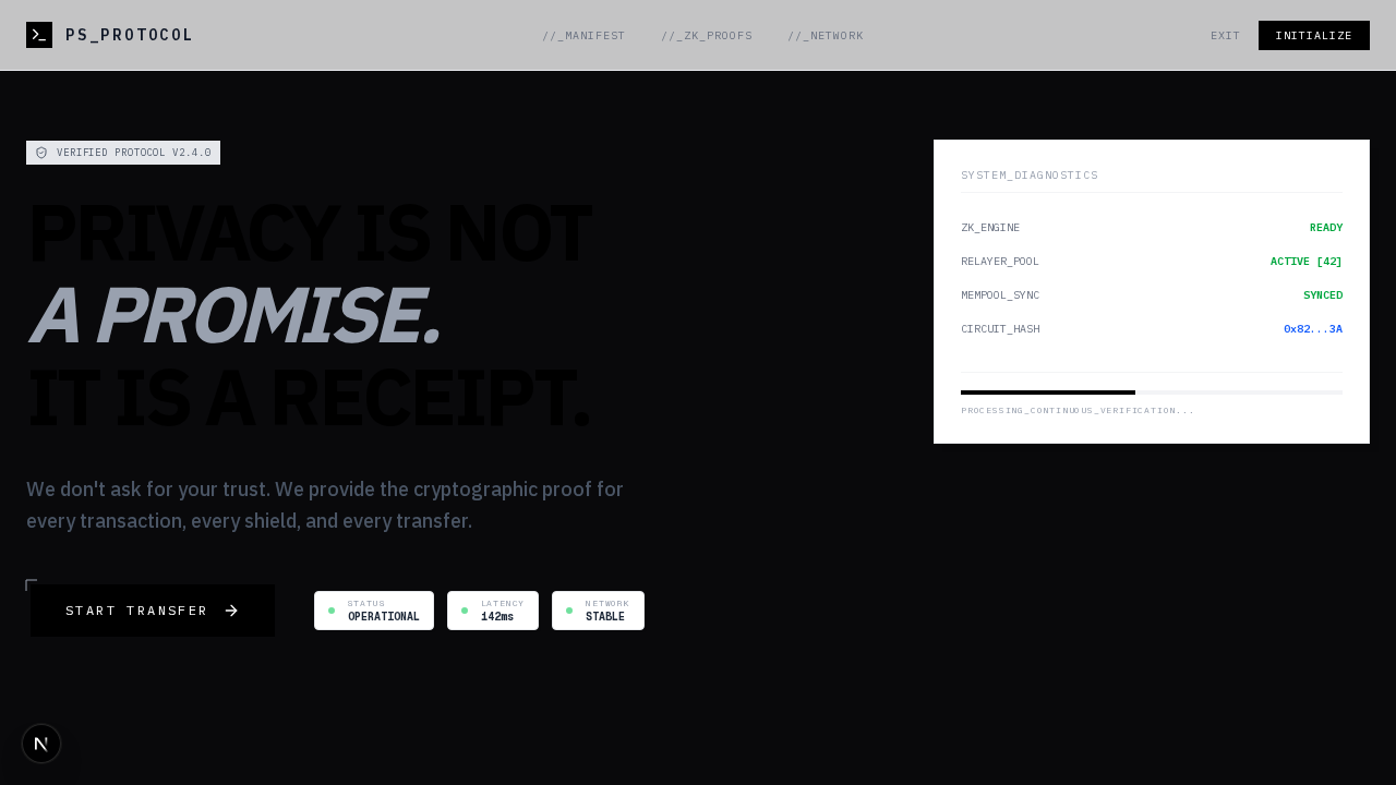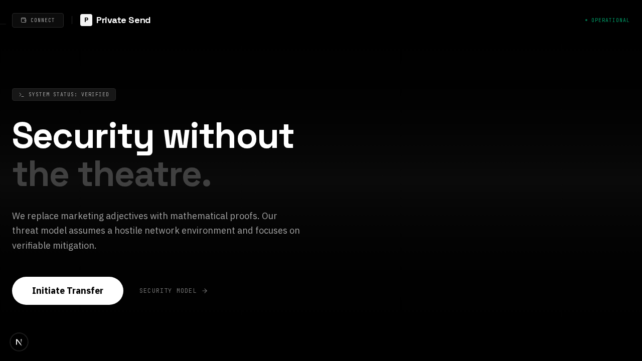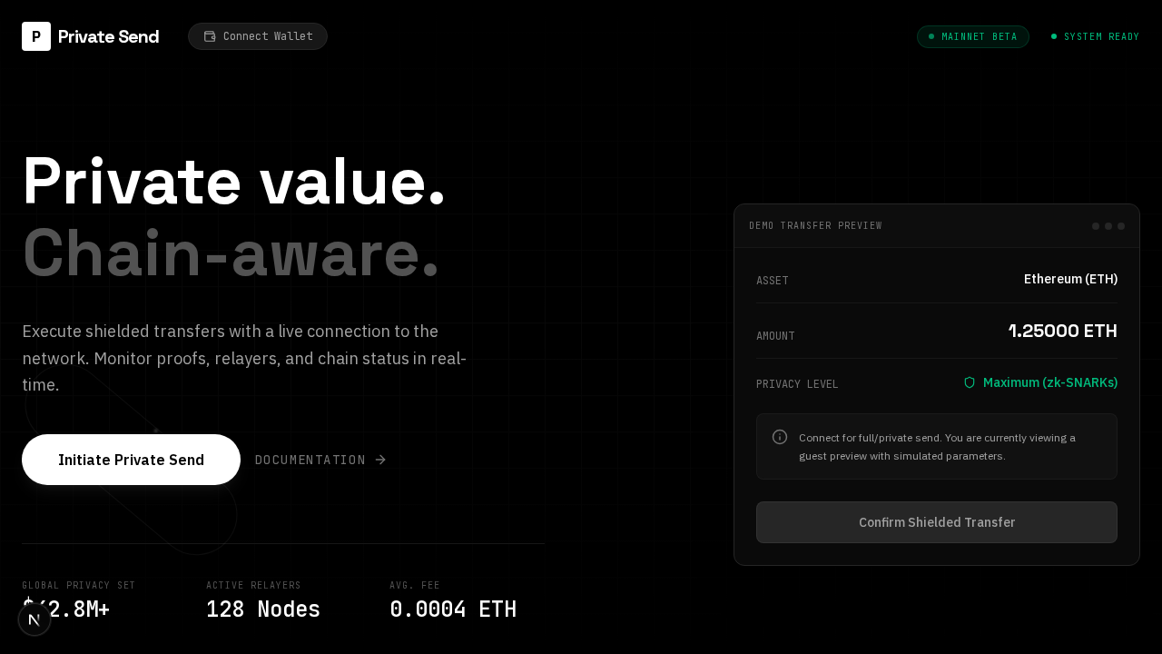 Dark infrastructure with a live connection. Execute private value transfers with real-time status and verifiable proofs.